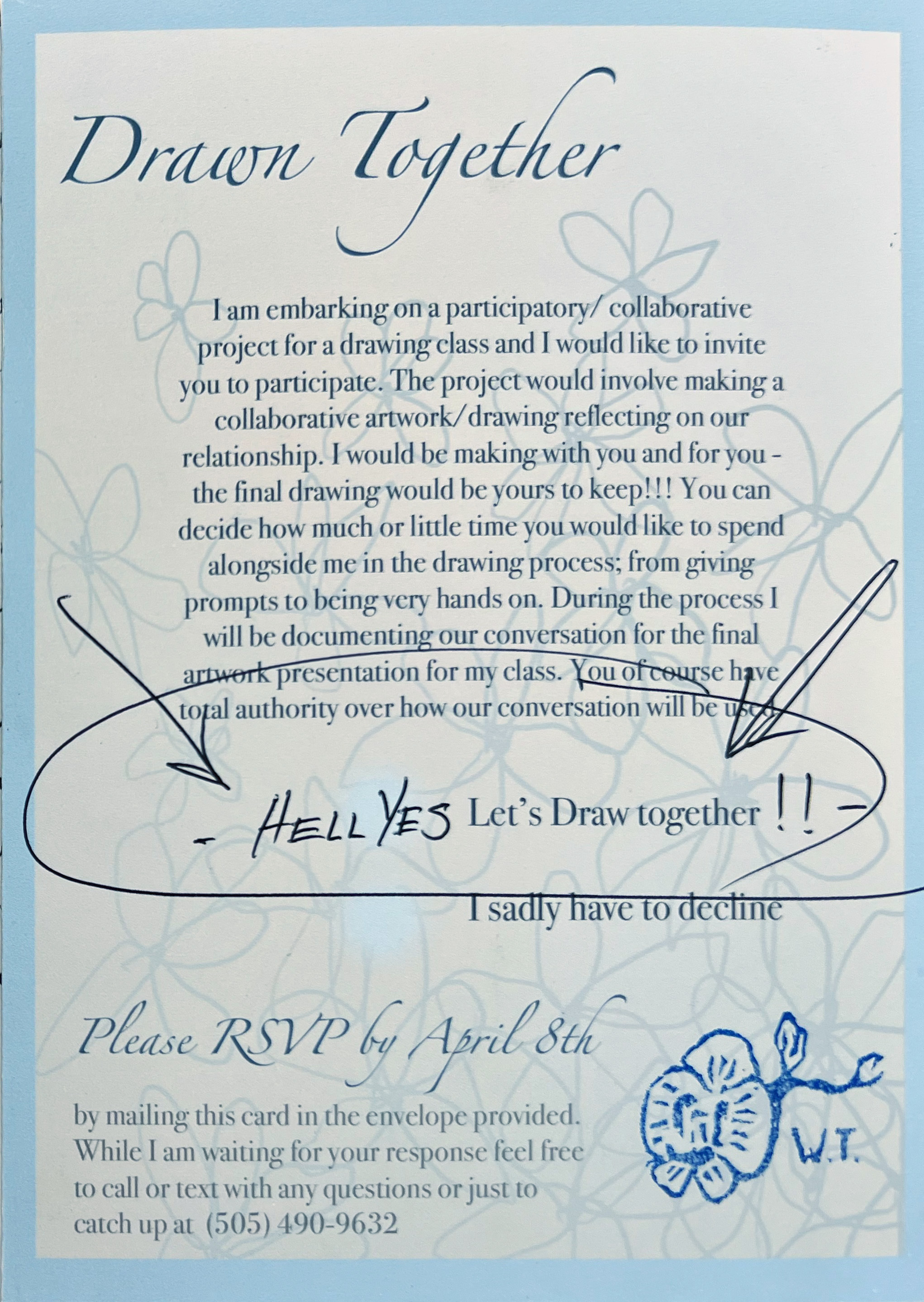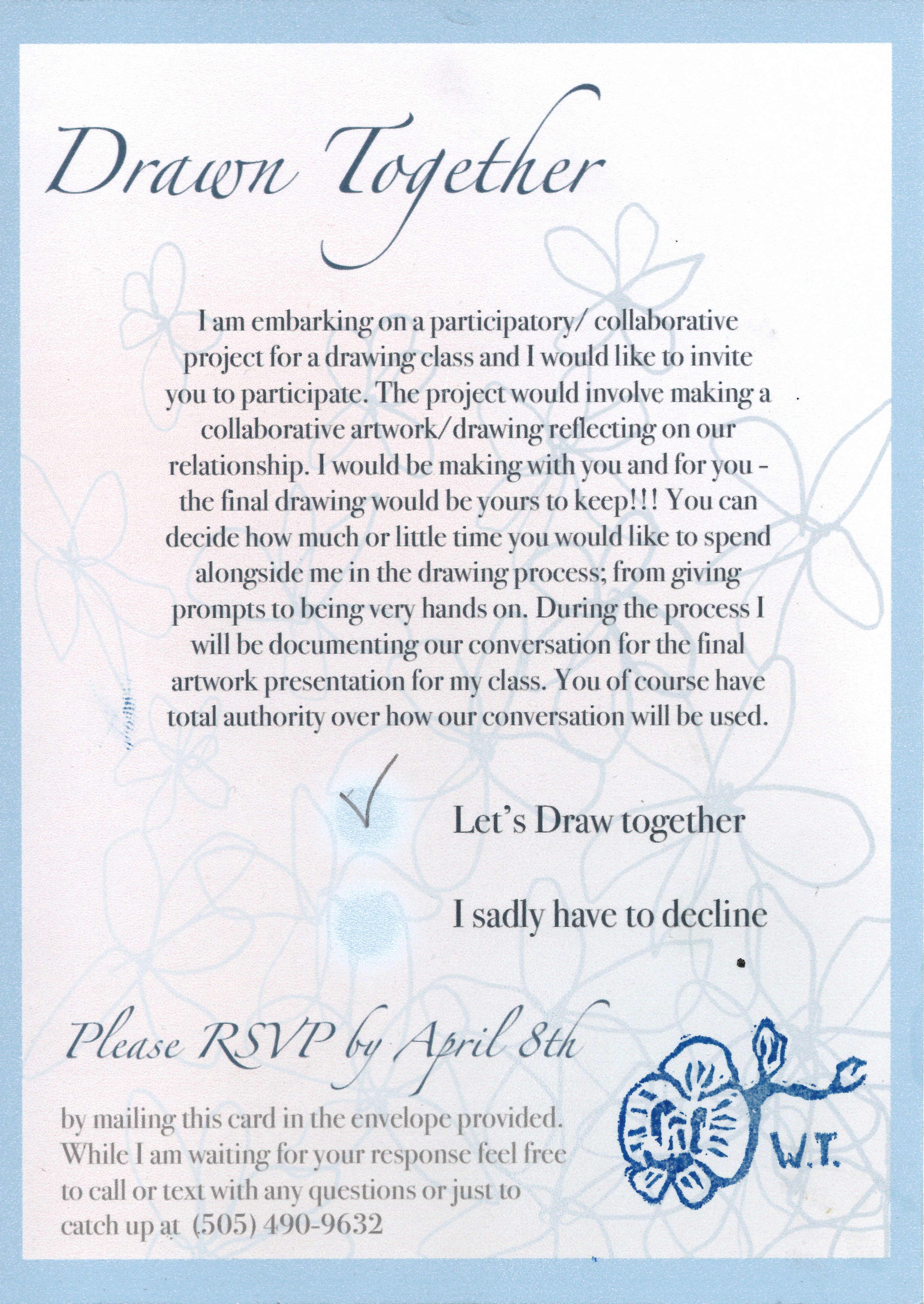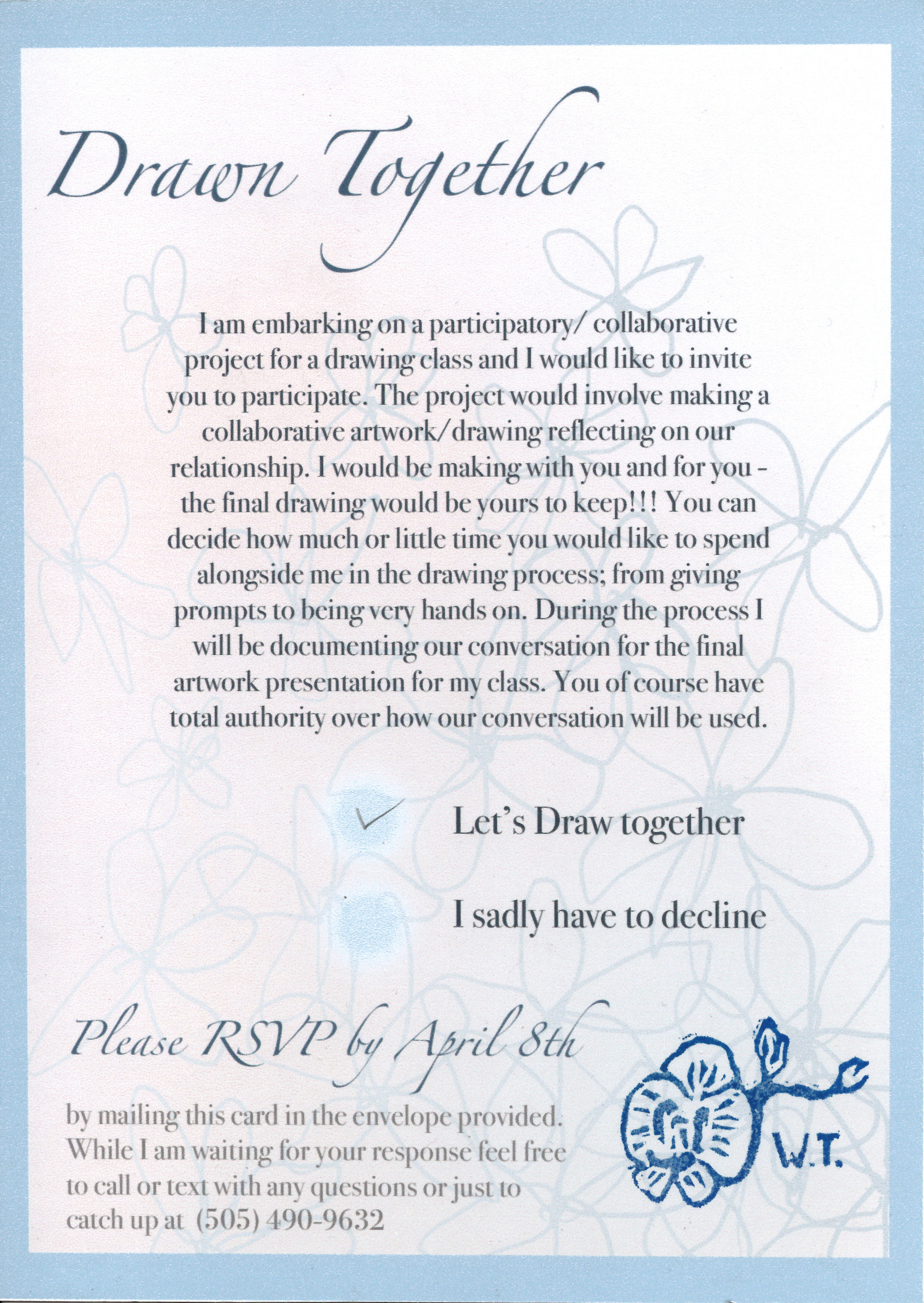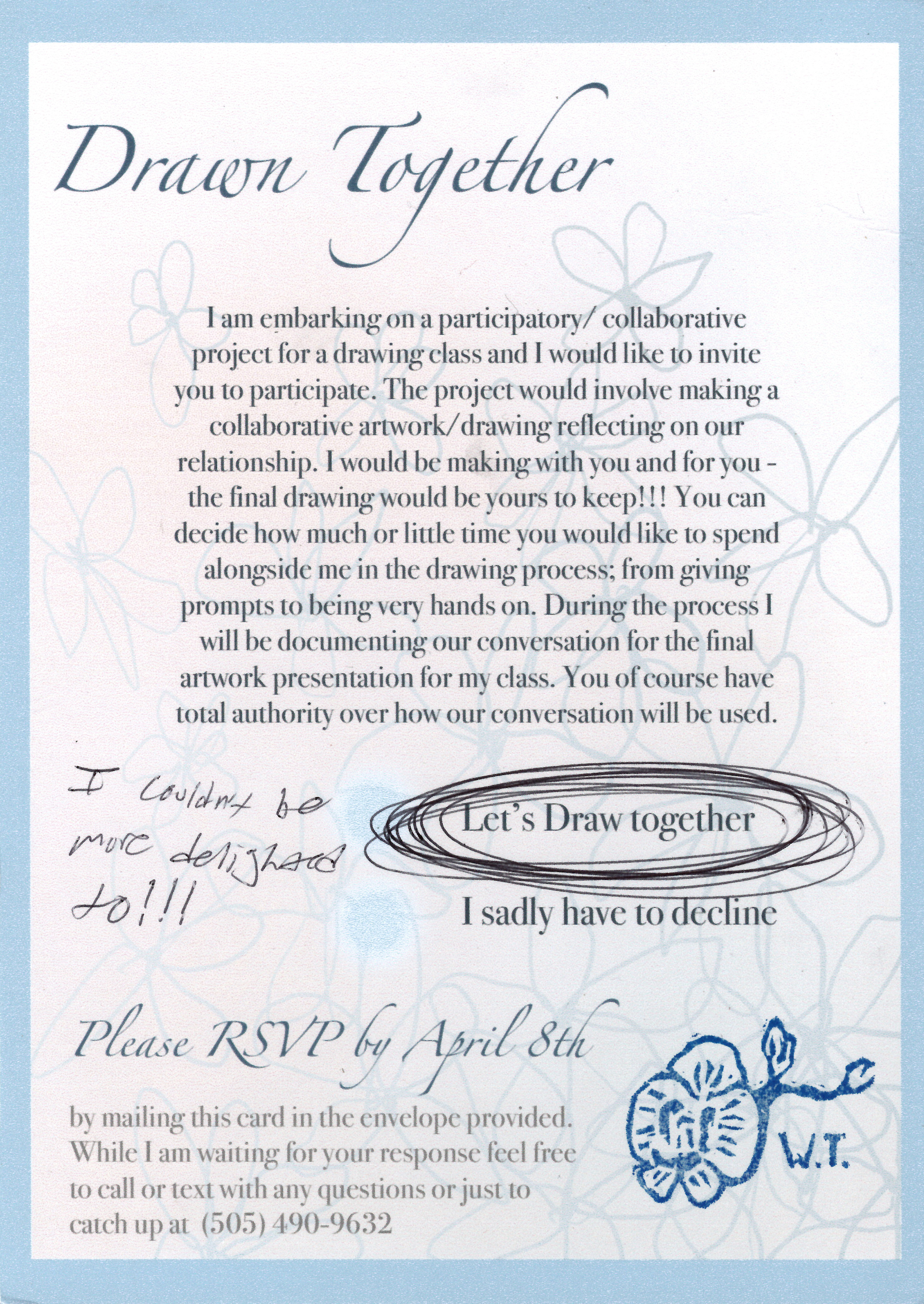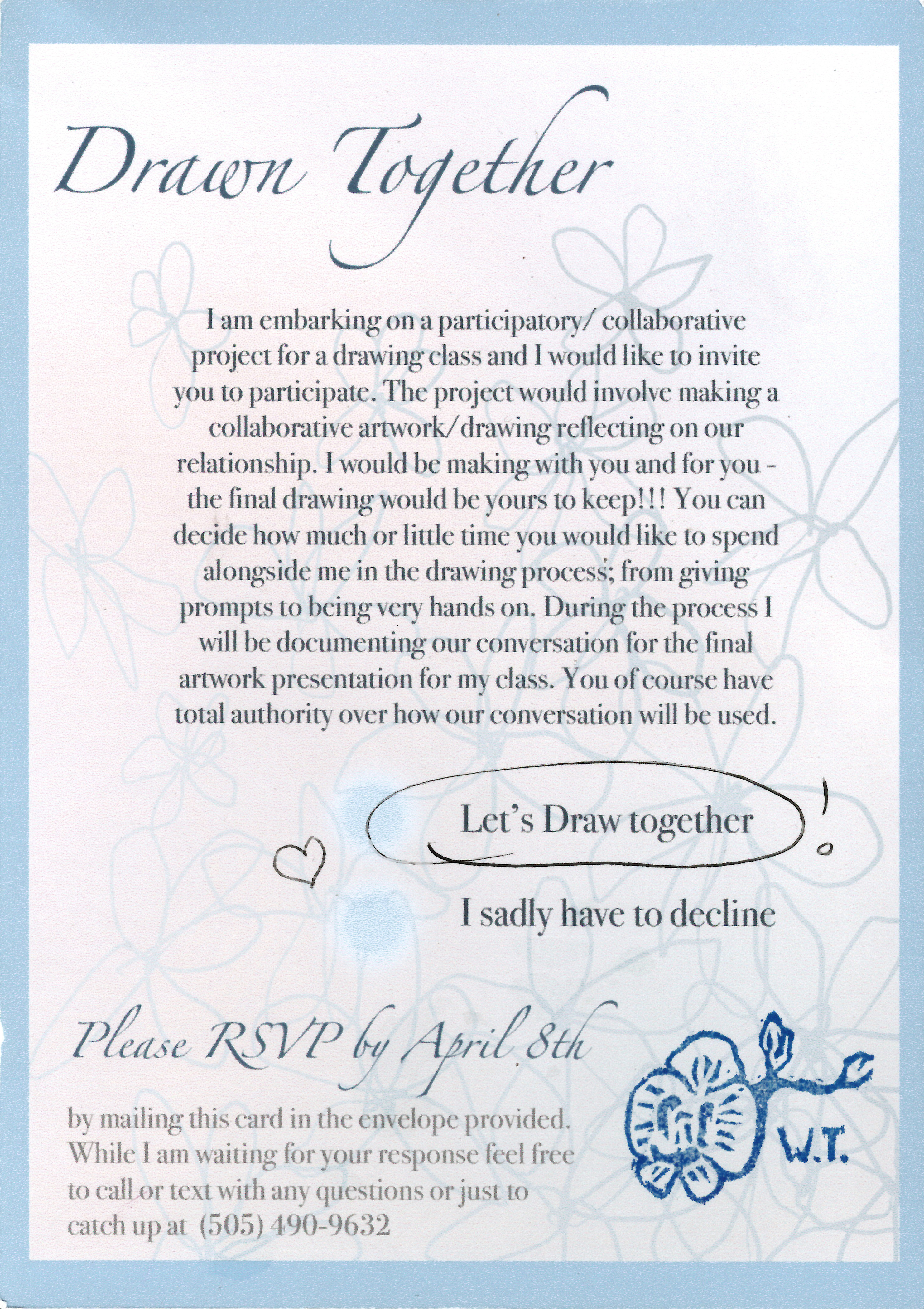 Gratitude and partnership are vital to maintaining close relationships with those around you and living a more enjoyable life. I work with gratitude to brighten my personal experience and to reach out to and connect with loved ones. I do this by writing gratitude letters to loved ones and inviting them to make a collaborative piece with me. The artwork created stems from the recipients' wants, which could be anything from forging a knife to painting a pug wedding. The art is then given to the recipient to finish or to display how they wish. The process is an exercise in giving without any expected return past the joy of expressing my love for the people in my life.